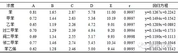取5個潔凈20ml頂空瓶,準確加入5ml蒸餾水后,再用微量注射器準確吸取苯系物混合溶液各1、2、4、8、16μl后,密封,作為供試液。