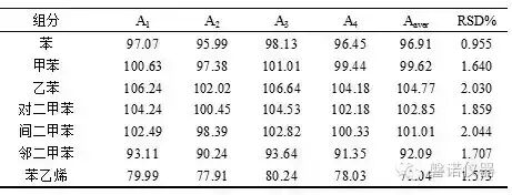 取4個潔凈20ml頂空瓶,準確加入5ml蒸餾水后,再用微量注射器準確吸取苯系物混合溶液適量,密封,作為供試液,在優化的色譜條件下,重復分析4次,7種組分的峰面積一致,RSD%均小于2.5%,表明儀器精密度良好。